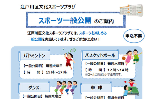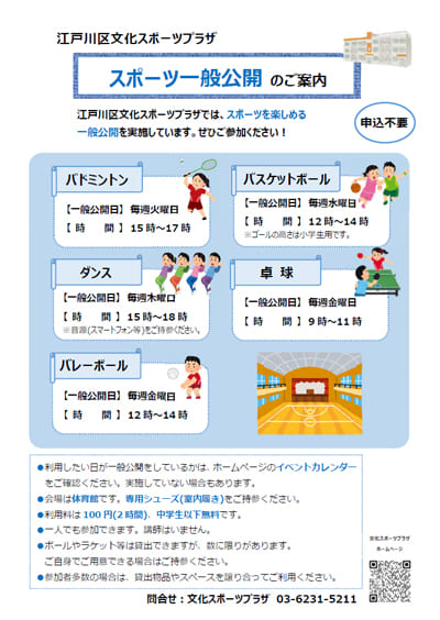 【申込方法】電話(03-6231-5211 受付時間: 9:00 ~ 21:30)もしくは江戸川区文化スポーツプラザ窓口、公式ホームページよりお申し込みください。